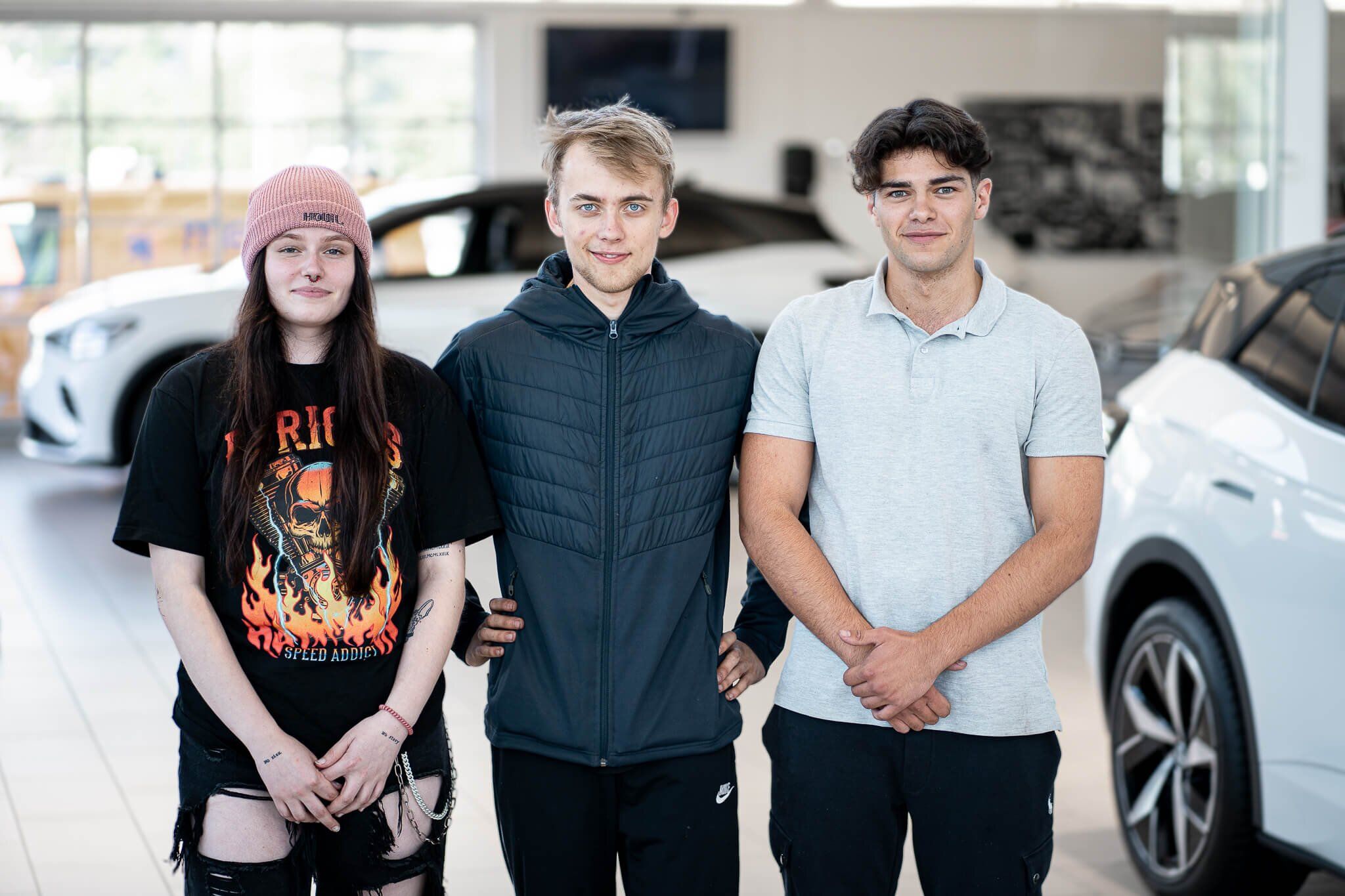 Nikola, Torstein og Jonas er tre av elevene som besøkte Møller Bil-forhandleren. De er alle begeistret for Møller Bil Skolen.