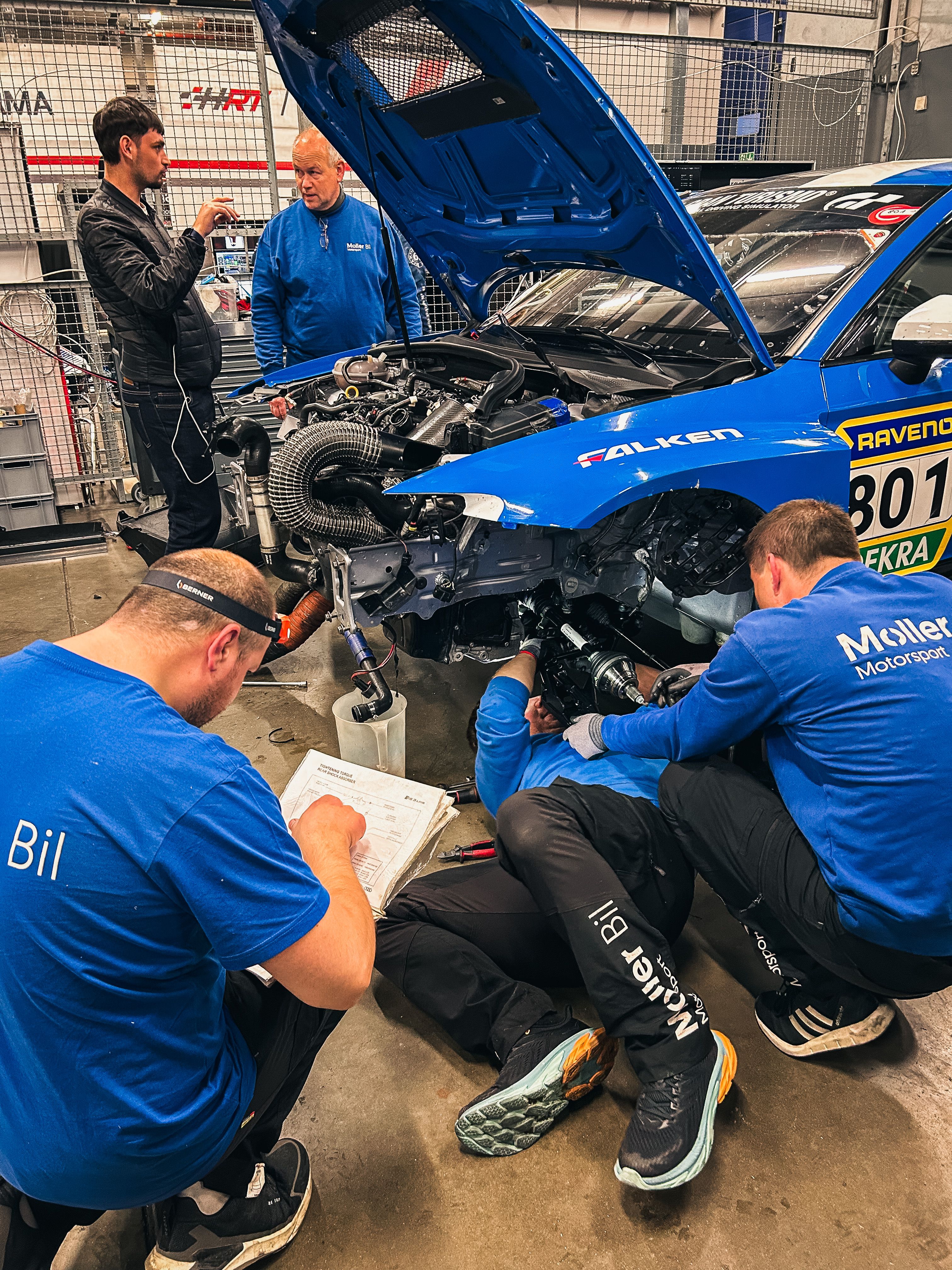 – Jeg er virkelig imponert over mekanikerne våre som skrur langt på natt for å få bilen i stand. Våre faste mekanikere har erfaring fra dette, men gjestemekanikere fra Møller Bil Oslo Vest og Møller Bil Skadesenter Trondheim gjør også en imponerende innsats, sier teamsjef Espen Wiik.
