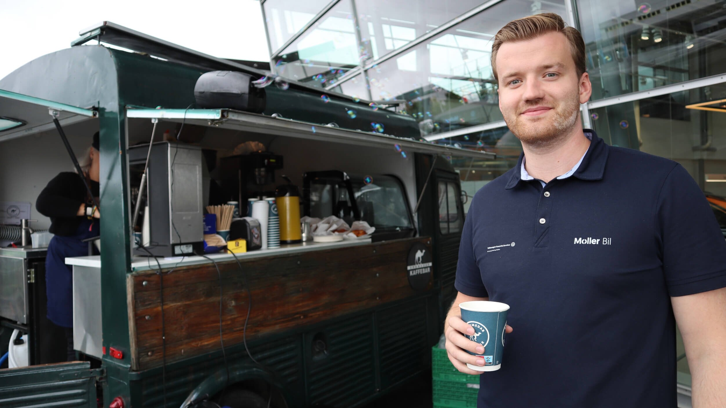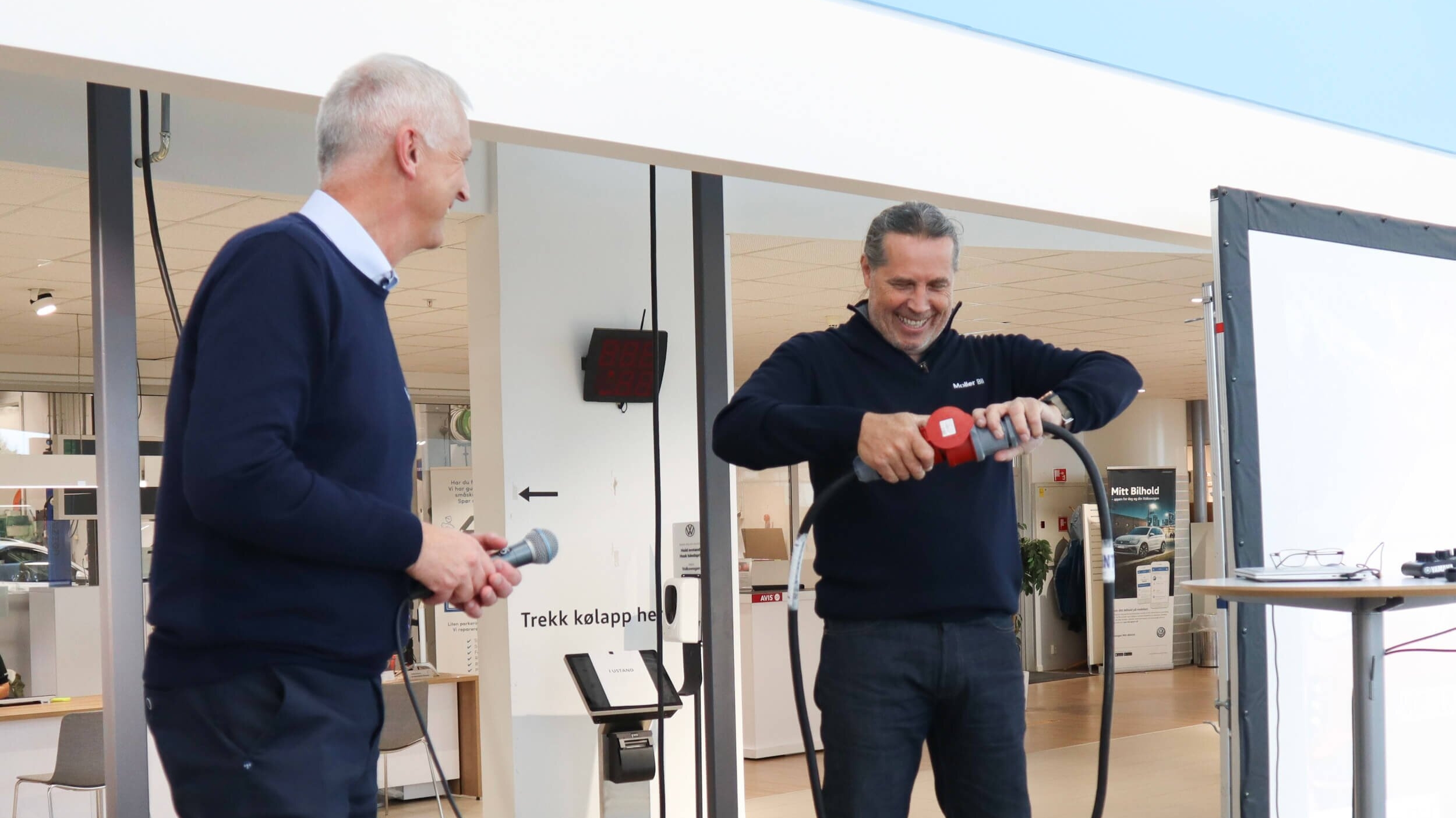 De ansatte hos Møller Bil i Trondheim koste seg på feiringen til tross for at solen ikke skinte på solcellene akkurat i dag. Volkswagen selger Jonas Laug Årnes forteller at han er veldig stolt av å ha en arbeidsgiver som tar bærekraft på alvor. Han synes det er spennende at ansatte og kunder fremover vil kunne se effekten av solcelleanlegget på skjermer inne på anlegget.