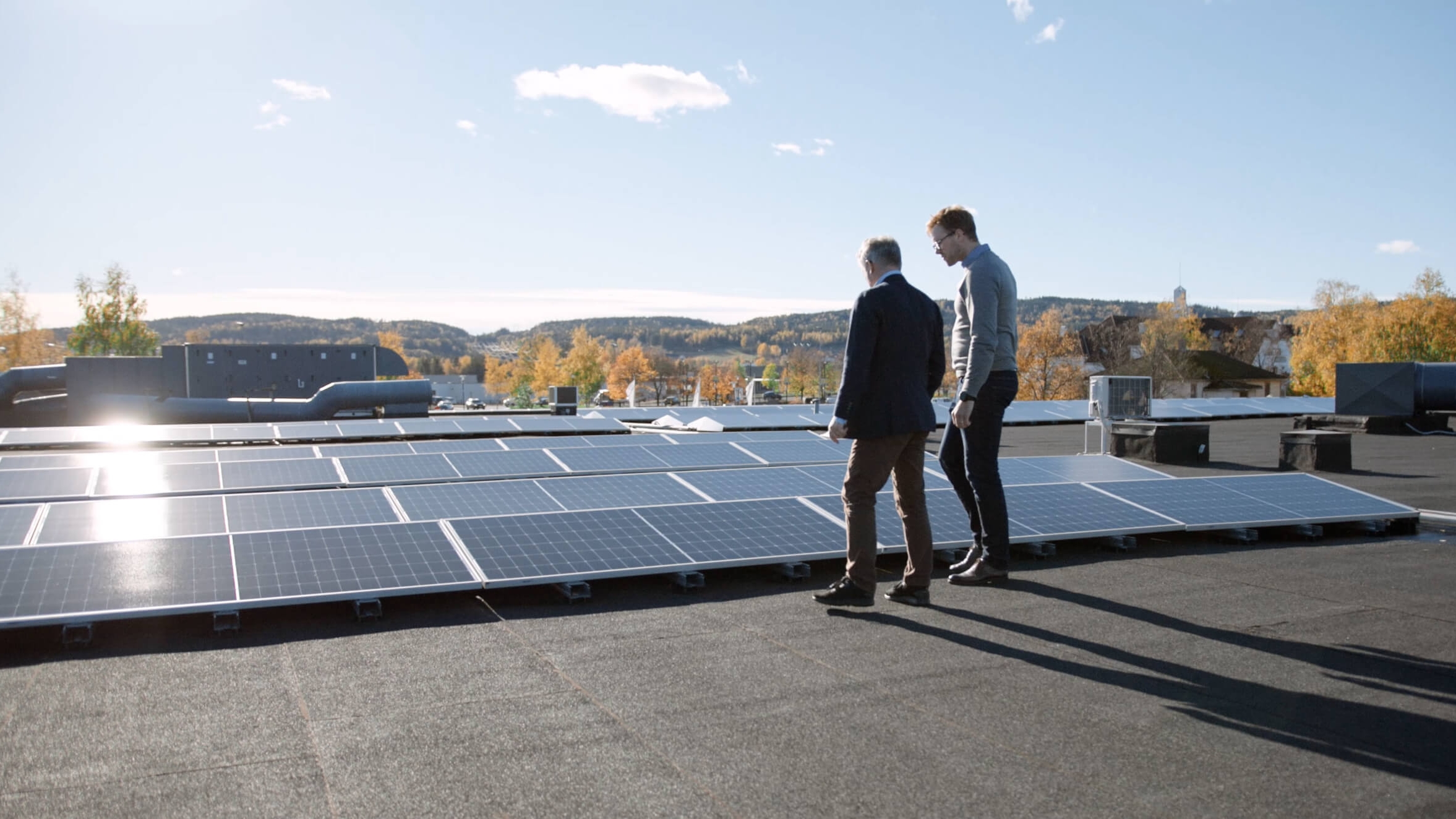 Åsmund og daglig leder hos Møller Bil på Hvam, Erik Gjellan, inspiserer solcellene på taket hos forhandleren.