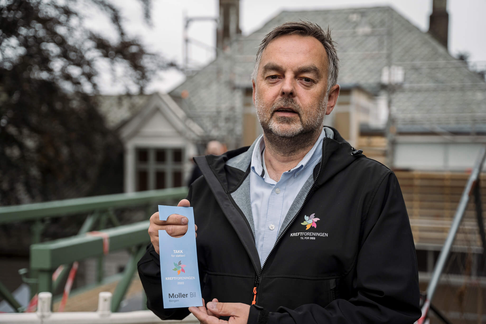 Geir Vangsnes, driftsleder for Kreftforeningen i Bergen, viser stolt fram materiellet som Møller Bils forhandlere henger på speilet i alle biler de har solgt.