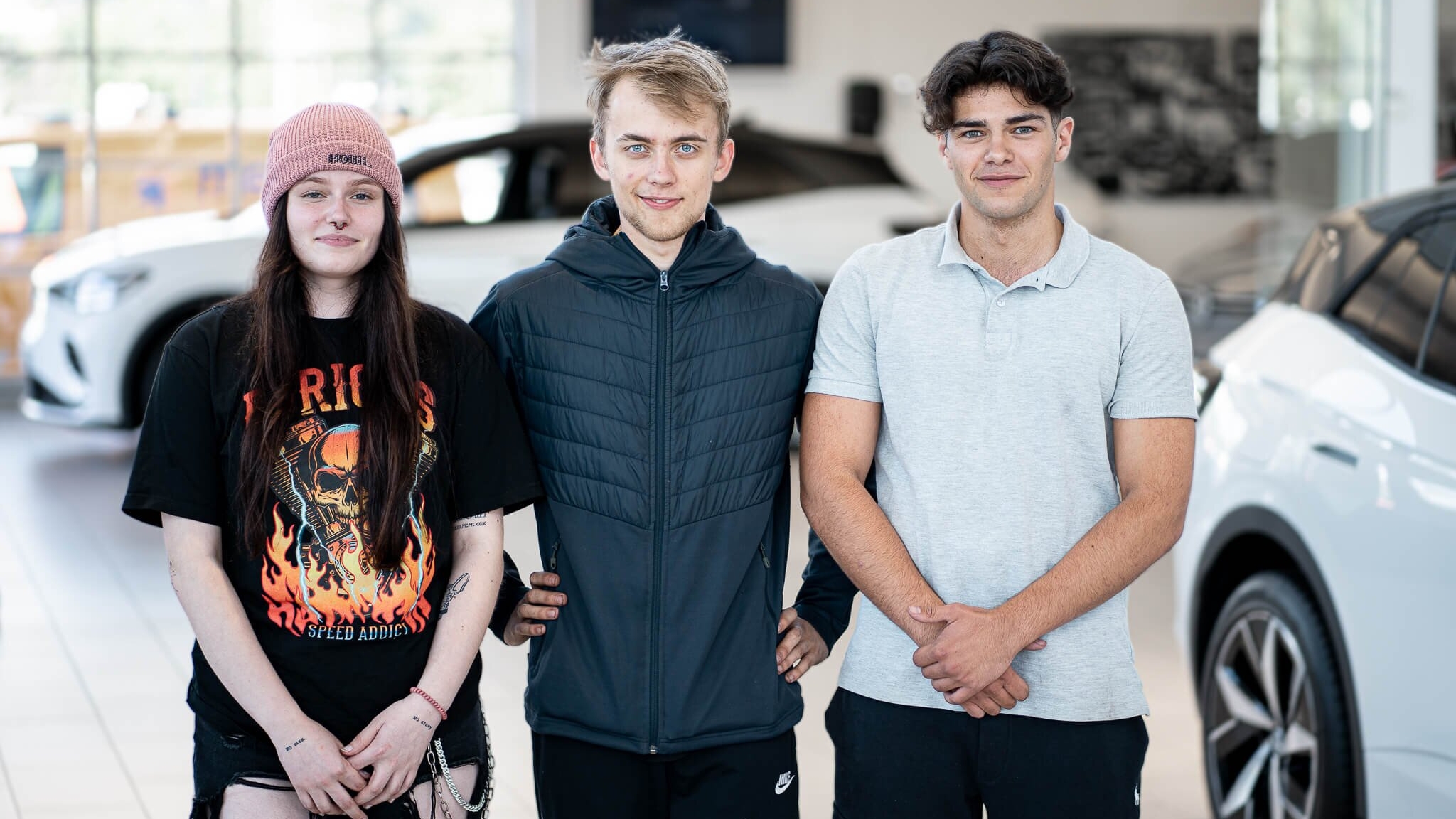 Nikola, Torstein og Jonas er tre av elevene som besøkte Møller Bil-forhandleren. De er alle begeistret for Møller Bil Skolen.